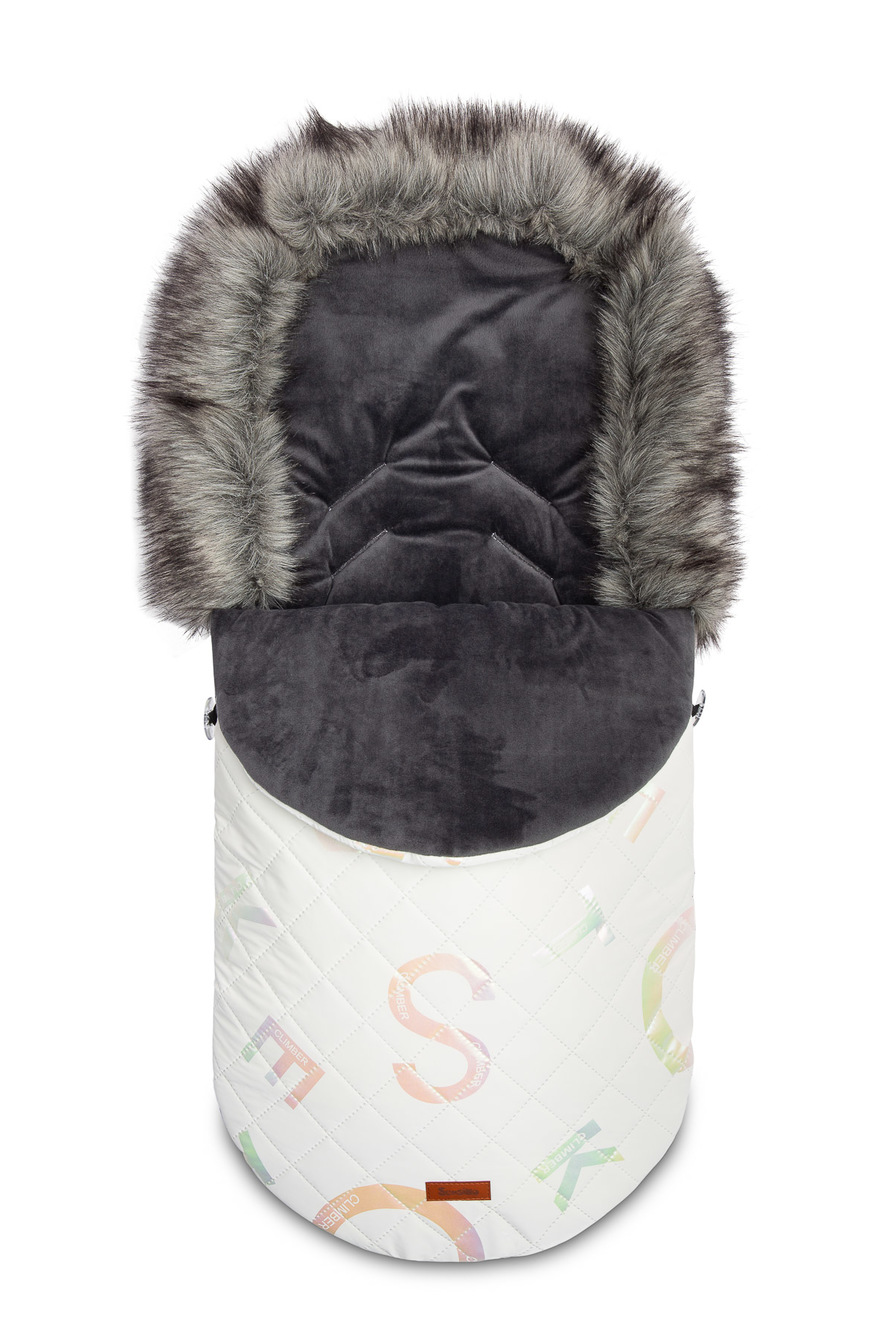 Det yttre lagret på åkpåsen har ett vattentätt och vindtätt material som fungerar bra på vintern. Den har ett effektfullt mönster med skimrande bokstäver. Åkpåsen är fylld med varm och skön fleece på insidan. Fyllningen är ett lager polyesterisolering som ger tillräcklig isolering. Hålen för 5-punktsbältena gör det möjligt att säkert spänna fast barnet. Lämplig för djupa barnvagnar, sittvagnar och som en sovsäck för pulka. Den har en dragkedja som gör att du snabbt kan lossa eller helt ta bort det översta lagret.