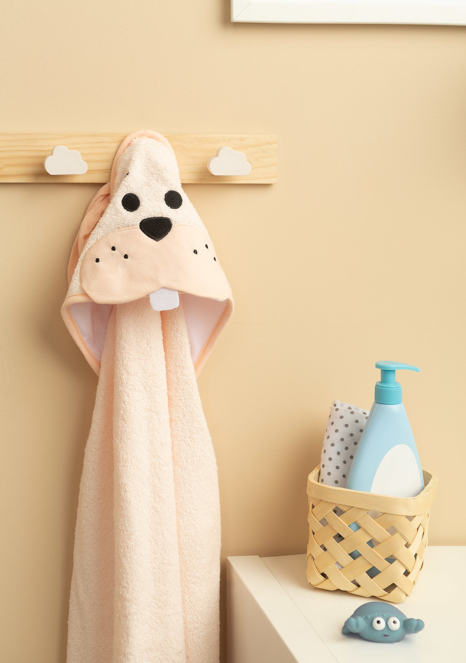 Huvan skyddar barnets huvud från kylan och gör det lättare att snabbt torka barnets hår. Applikationer i form av söta djur lockar barnets uppmärksamhet och gör badandet till en fin detalj varje dag.