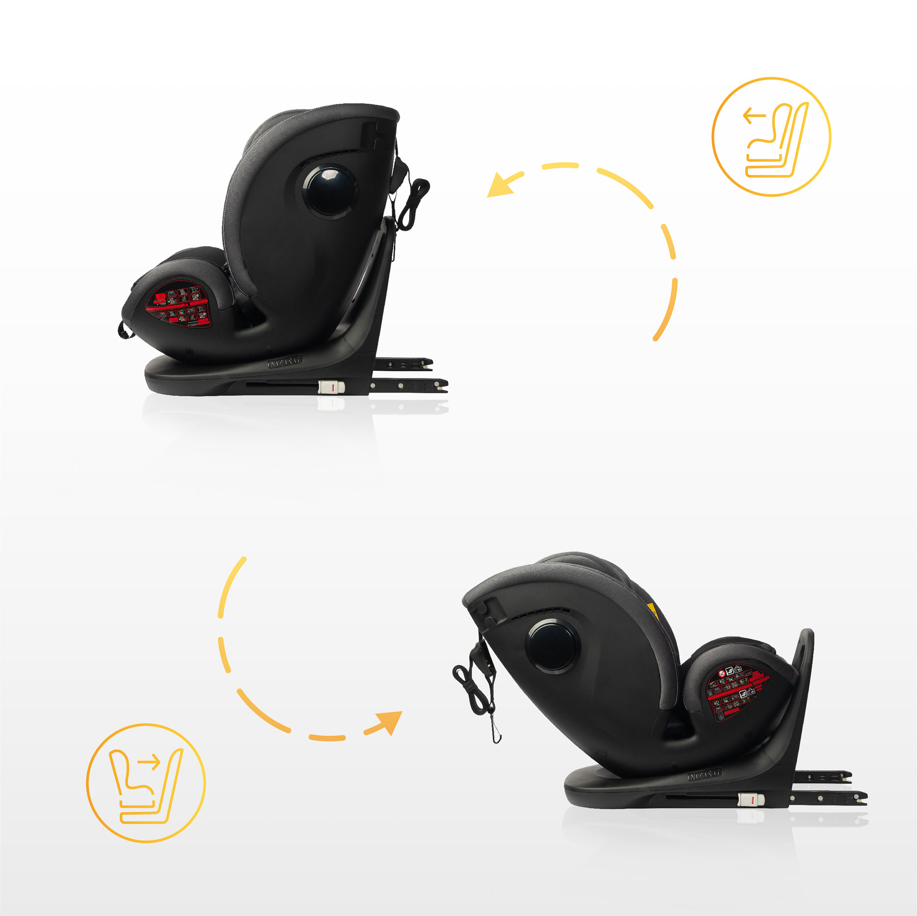 360-graders rotation så att du kan välja om barnet ska sitta fram eller bakåtvänd. Man kan även vända stolen mot dörren, vilket gör det möjligt för föräldrar att enkelt placera barnet i stolen.
