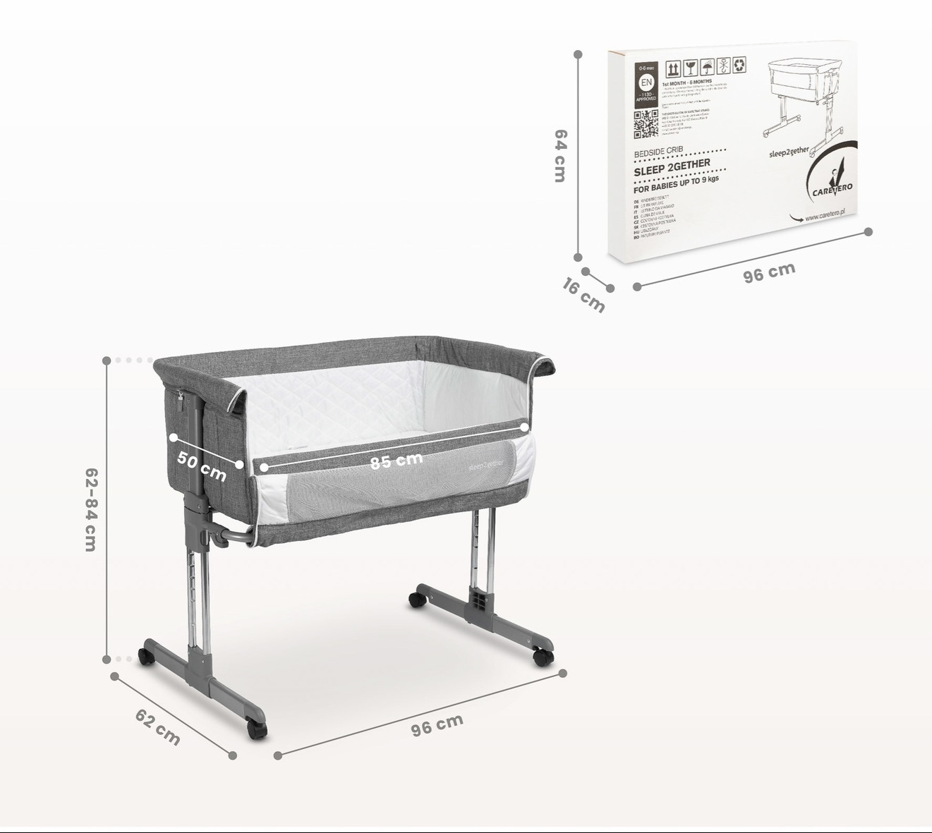 En säker och praktisk sidosäng i grafitgrå färg. Sleep2gether är en innovativ 2-i-1-spjälsäng som fungerar utmärkt både som en traditionell spjälsäng och en samsovsäng. Framsidan är öppningsbar och har praktiska handtag, vilket möjliggör snabb förvandling och gör det enkelt att ta hand om barnet under sömnen.